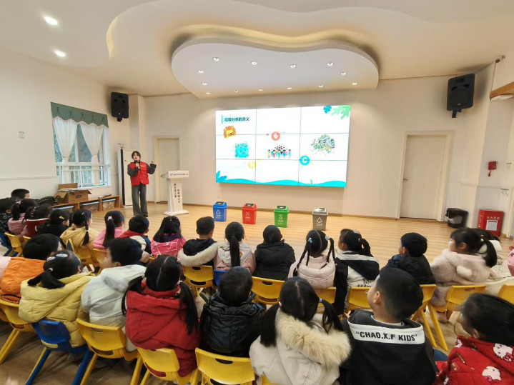 当天上午,在彭镇幼儿园的活动现场,垃圾分类讲师通过视频展示了垃圾对环境的危害,让孩子们直观感受到环保的重要性。生动的课件和通俗易懂的讲解,让小朋友们听得津津有味。为了加深理解,活动还设置了模拟实践互动游戏。孩子们踊跃参与,将印有不同垃圾的卡片投入对应的垃圾桶中,在实践中巩固分类知识。